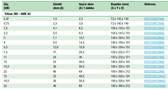 - ATV310***F referanslarında dahili C3 seviye EMC filtre bulunur.