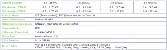 Sensörsüz vektör kontrollü AC mikro sürücü serileri VFD-EL / VFD-E; esnek opsiyon kartlarına sahip modüler yapısı, dahili EMC ve RFI filtre, yan yana montaj imkanı, aşırı yük koruması ve dahili potansiyometreye sahip tuş takımı ile üretilmiştir.